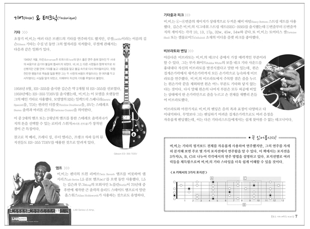 지난 반세기동안 비.비.킹(B.B.King)은 명실상부한 블루스의 제왕으로 군림해왔으며 그의 스타일은 블루스 기타리스트들과 록, 팝 뮤지션들에게 큰 영향을 주었습니다. 이 책에서 저자는 비.비.킹의 독특한 연주 패턴을 3가지의 포지션으로 나누어 치밀하게 분석하고 있습니다. 엄선된 76개의 다양한 릭과 9곡의 솔로 예제를 해설과 함께 수록하여 실제 연주에서도 쉽게 응용할 수 있도록 배려했으며, 95트랙에 달하는 오디오 CD에는 모든 예제의 모범 연주를 담았습니다. 멋진 디자인의 이 포켓북은 비.비.킹을 동경하는 블루스 기타 키드들과 기타 솔로를 공부하는 이들에게 좋은 길잡이가 될 것입니다.