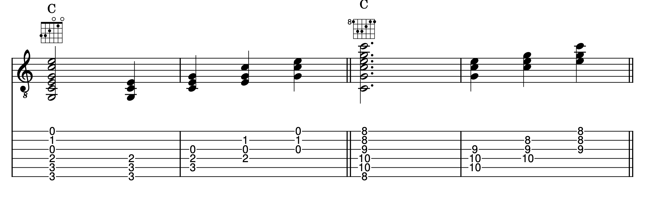 12가지의 코드폼이 생소하다면 아래의 오픈 코드와 바 코드를 살펴보기 바랍니다. 두 가지 C 코드를 연주할 수 있다면 이미 7가지의 메이저 트라이어드 코드폼을 알고 있는 것과 같습니다.