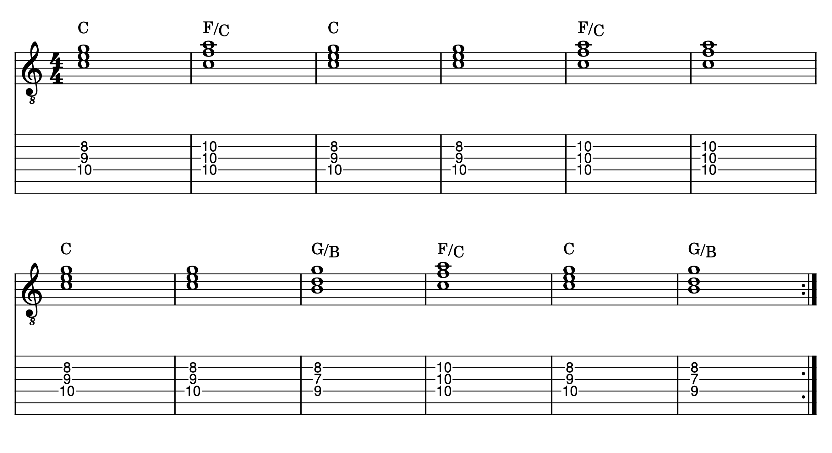 메이저 트라이어드를 연습하는 가장 좋은 예제는 메이저 코드만으로 이루어진 12마디 블루스 진행을 연주하는 것입니다. [Ex.1]은 5번줄에 루트가 있는 루트포지션의 C 코드, F 코드 그리고 G 코드를 을 사용한 예제입니다. [Ex.2]는 4번줄에 루트가 있는 루트포지션의 C 코드와 3번줄에 루트가 있는 두 번째 인버전의 F/C 코드 그리고 2번줄에 루트가 있는 첫 번째 인버전의 G/B 코드를 사용한 예제입니다.