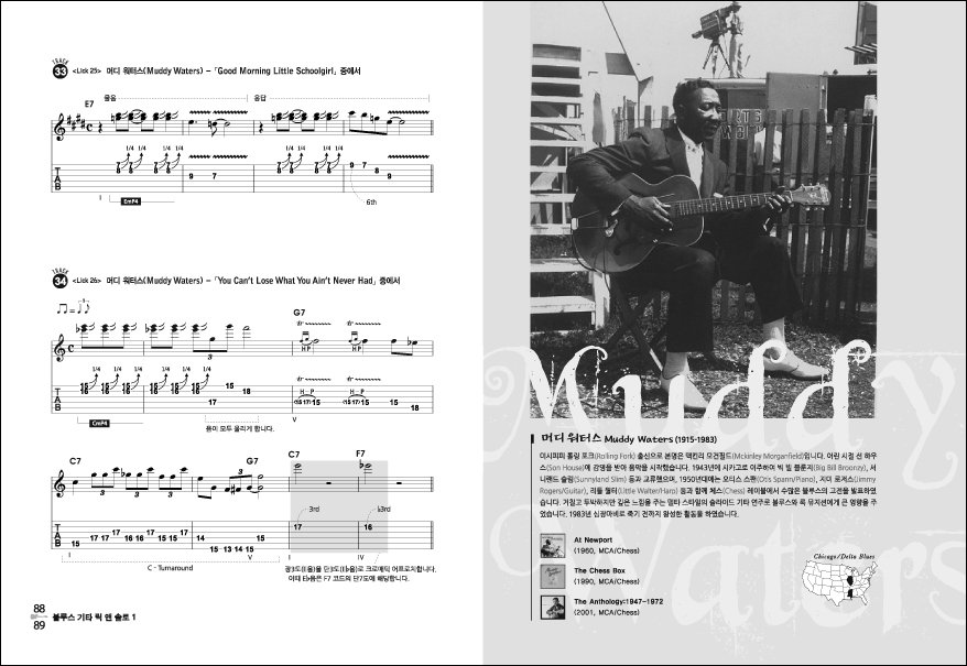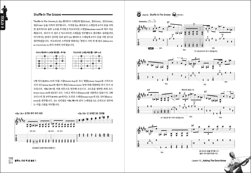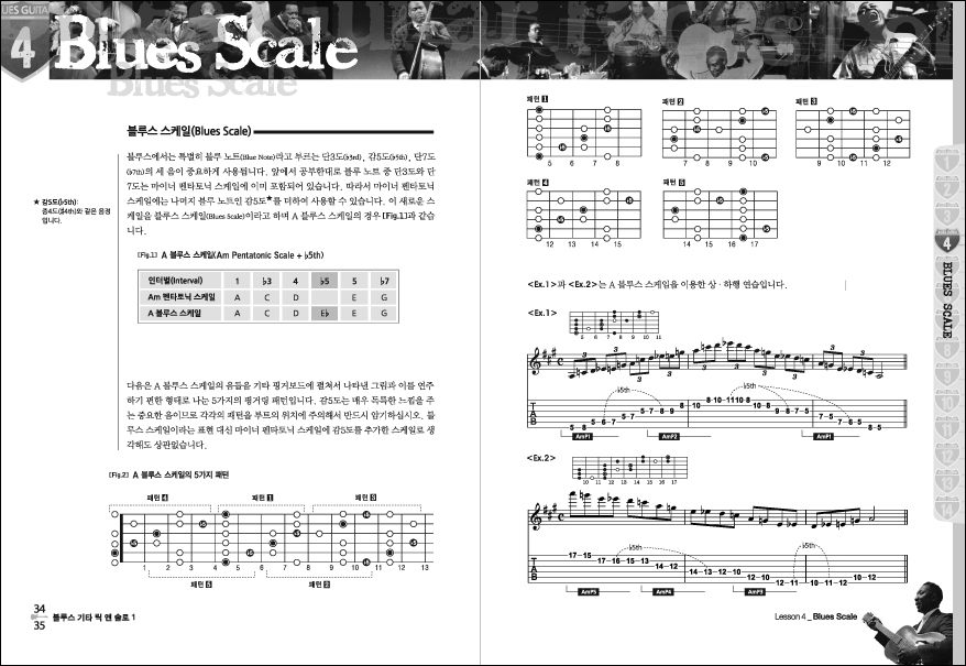 블루스 기타 릭 앤 솔로 1권은 마이너 펜타토닉 스케일과 메이저 펜타토닉 스케일을 기초에서 응용까지 쉽고 체계적으로 레슨하고 있으며, 60가지의 릭과 11가지 스타일의 솔로가 예제로 수록되어 있습니다.